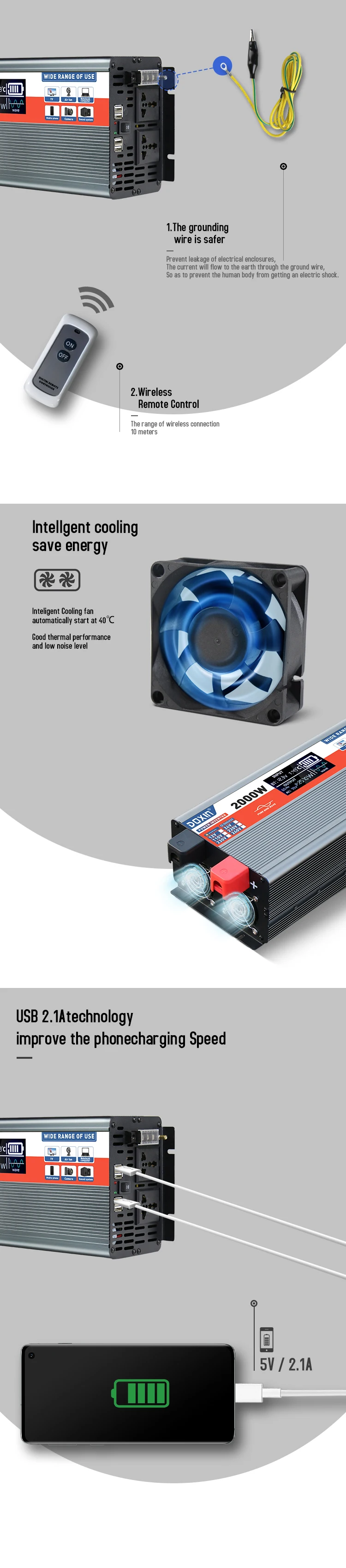 universal plugs are available worldwide, with 6 2.1A USBs 3. Dual fan cooling 4. Product with remote control 5. Product with
