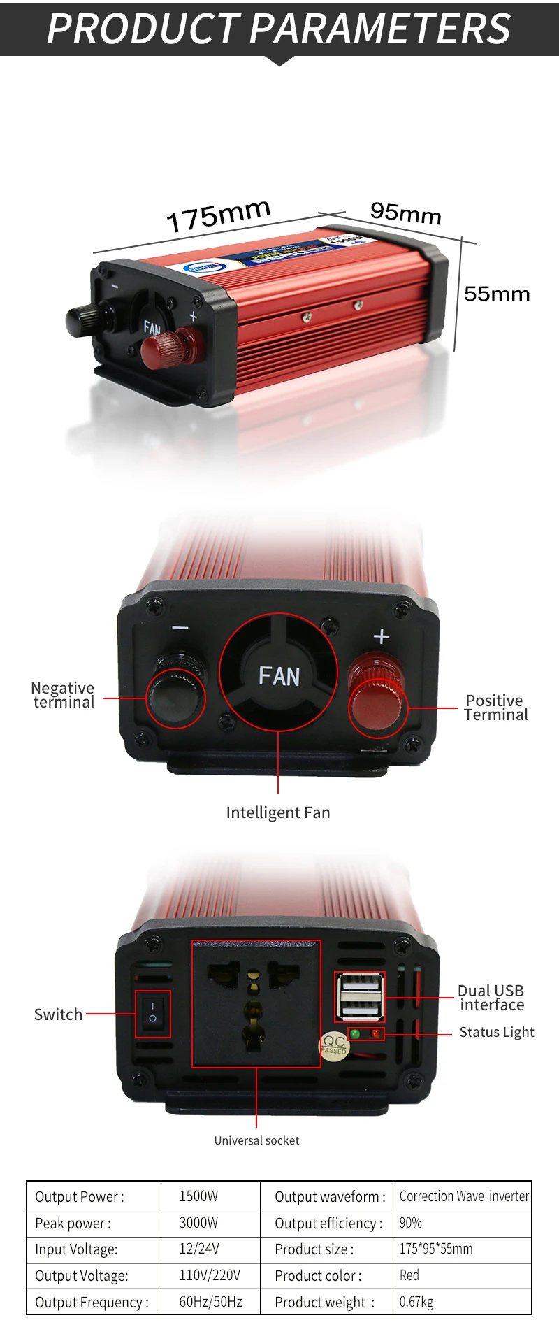 plugs are available worldwide, with two 2.1A USBs 3. Cooling fan cooling 4. Fixed output wiring